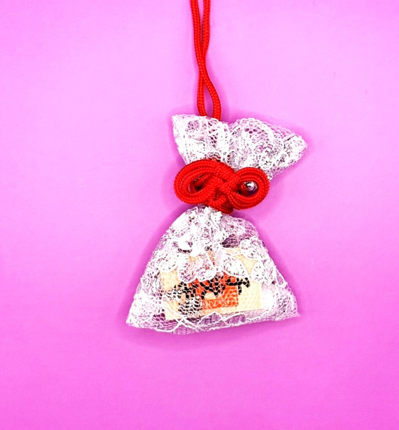 ご祈祷した石をレースの袋に納めた