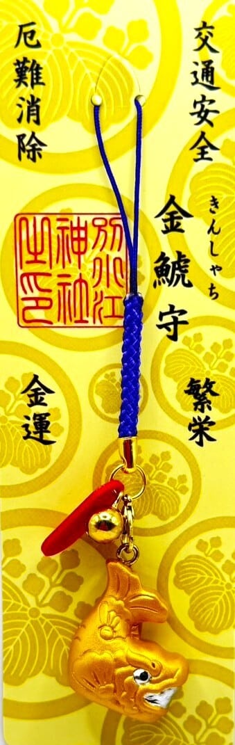 名古屋城の天守を守り続けてきた**金の鯱(きんしゃち)**をかたどった御守りです。